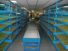 重力式貨架由托盤式貨架演變而成,采用輥子式軌道或底輪式托盤,軌道呈一定坡度(3°左右),利用貨物的自重,實現貨物的先進先出,一邊進另一邊出,適用于大批量、同類貨物的先進先出存儲作業,空間利用率很高,尤其適用于有一定質保期、不宜長期積壓的貨物。貨架總深度(即導軌長度)不宜過大,否則不可利用的上下“死角”會較大,影響空間利用,且坡道過長,下滑的可控性會較差,下滑的沖力較大,易引起下滑不暢、阻住,托盤貨物的傾翻。為使下滑流暢,如坡道較長,應在中間加設阻尼裝置,為使托盤貨物下滑至最底端時不致因沖擊力過大而傾翻,應在坡道最低處設緩沖裝置和取貨分隔裝置,因此設計、制造、安裝難度較大,成本較高。此類貨架不宜過高,一般在6m以內,單托貨物重量一般在1000kg以內,否則其可靠性和可操作性會降低。此類貨架系統目前在國內應用不是很多。